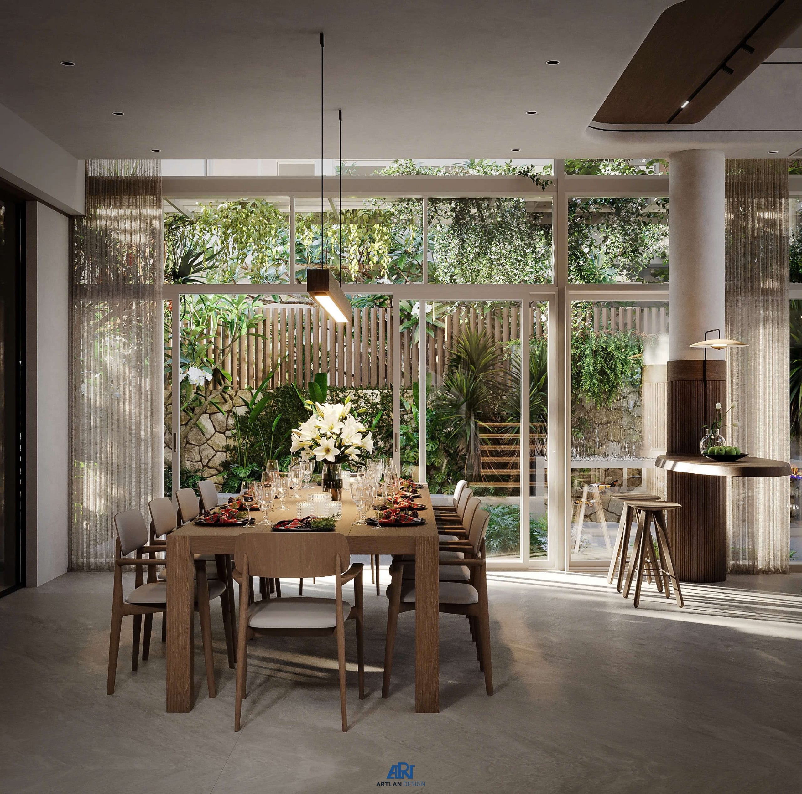 Sân vườn được xem như “trái tim” của ngôi nhà với thác nước, cây xanh và khu vực bàn ăn ngoài trời – vừa tạo cảnh quan, vừa là nơi gia đình thư giãn, kết nối. Bên trong, phòng khách và phòng ăn được thiết kế mở, sử dụng hệ cửa kính lớn để đón trọn ánh sáng tự nhiên, kết hợp nội thất tối giản và tông màu trung tính, mang lại cảm giác nhẹ nhàng nhưng vẫn tinh tế.